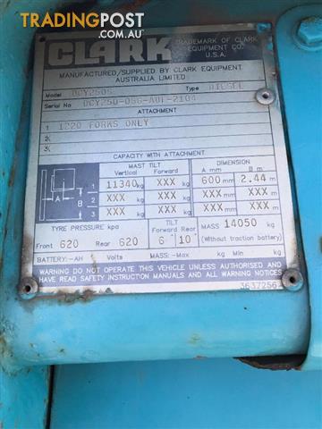 Clark, DCY250S, Forklift, 6 Cyl, Diesel, Serial No.:DCY250-056-AUF-2104, Engine No.:3540166937, Max Lift Capacity: 11,340Kg, Max Lift Height: 2.44m, Two Stage Mast, ROPS, Pneumatic Tyres, Blue colour, 3,153 Hrs
